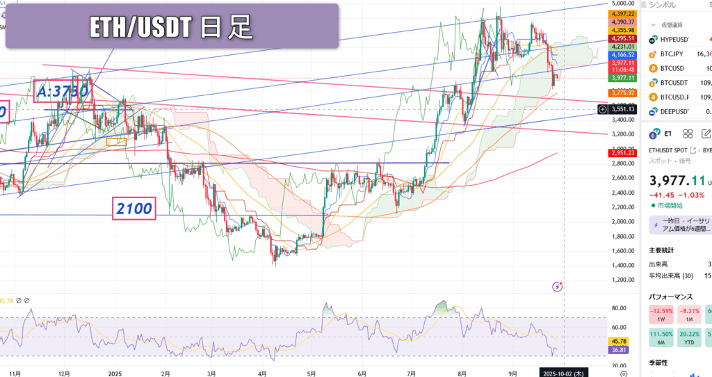 ETHは先週末時点4500ドルから安値3850ドルまでかなりの売り込み。