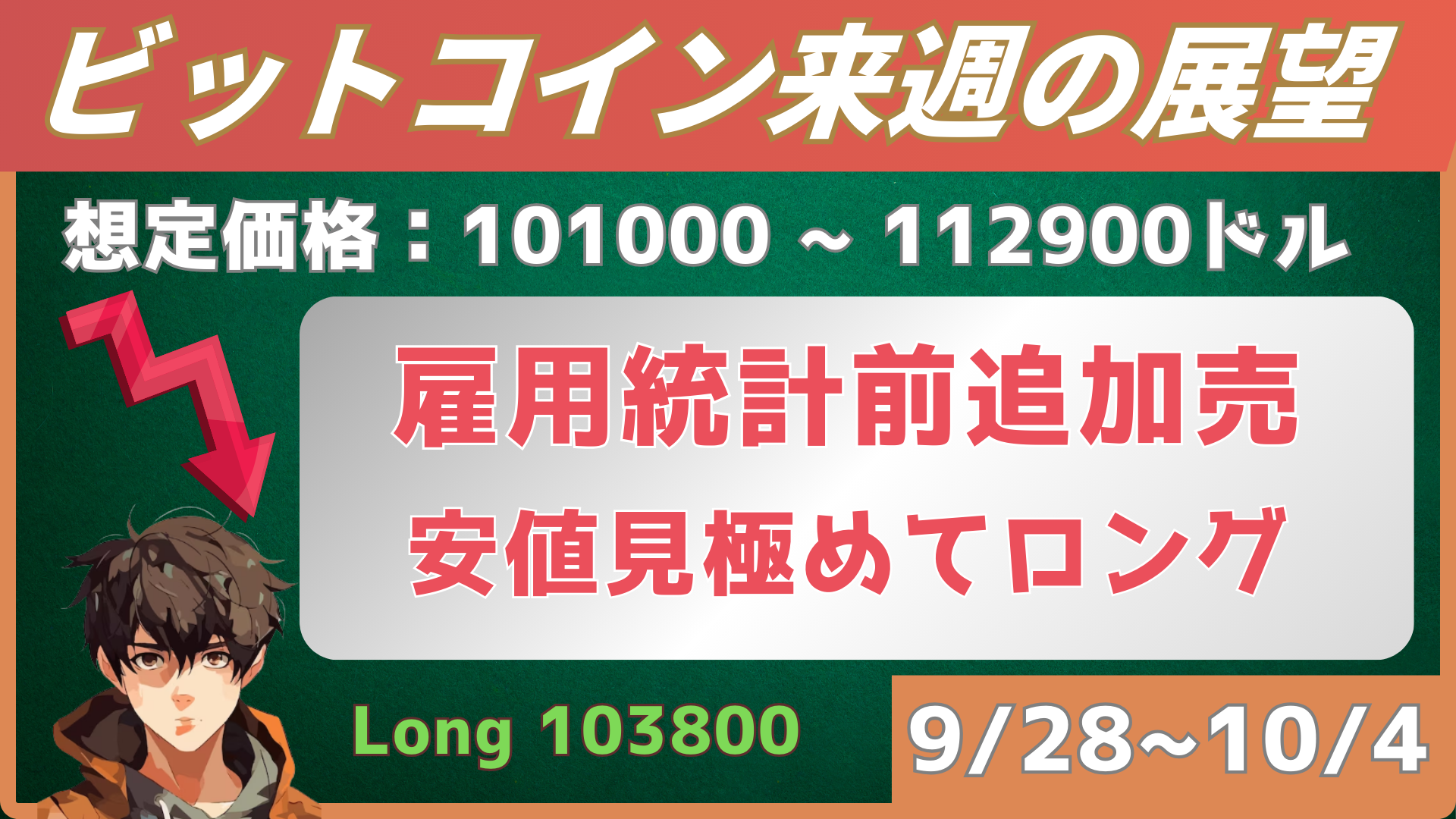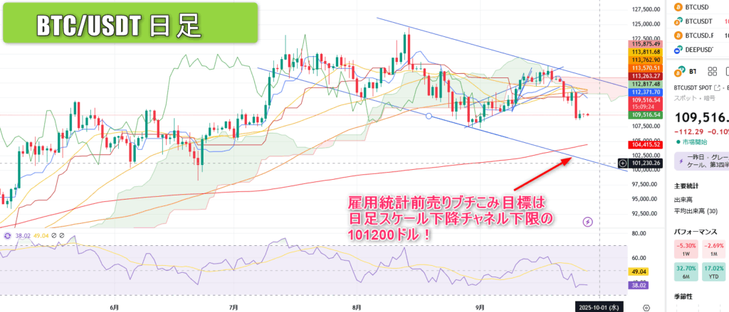 CryptoWalkerとしては、10月2日までに105000ドルまでの下落は確実視しています。また、9月上旬から狙っていた101800ドル下落について、現状も狙いを維持しています。