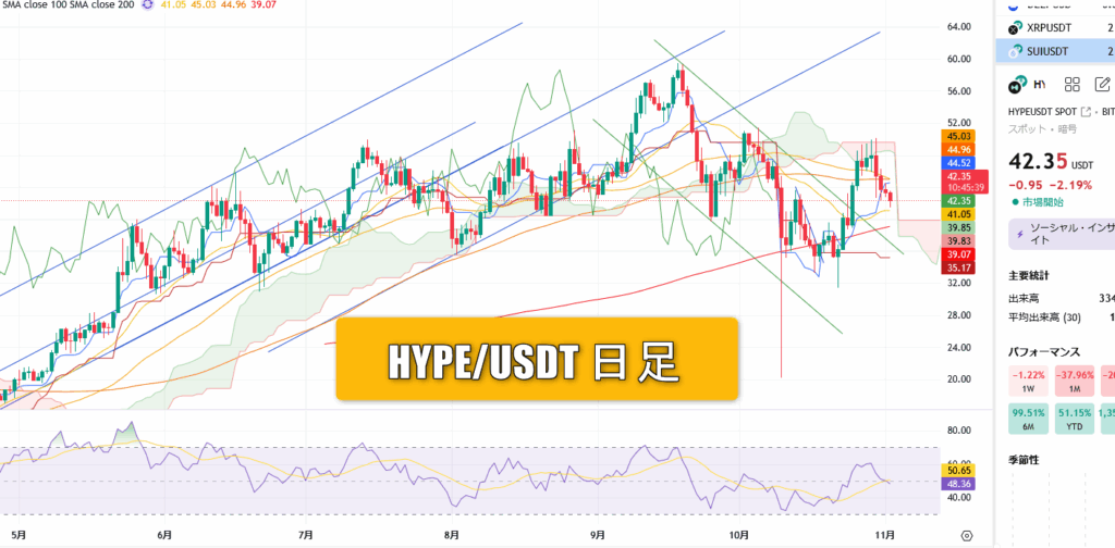 SUIスイは10月17日安値を割ってロングを消しに来る展開。一発大き目の買いが入った場合、そのへんで半利確して様子見か?