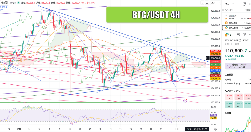 チャート的には大きなウェッジが意識され、上値113000付近が重く、ネガティブにウェッジ下限まで売り込まれ波乱となりやすい状況。