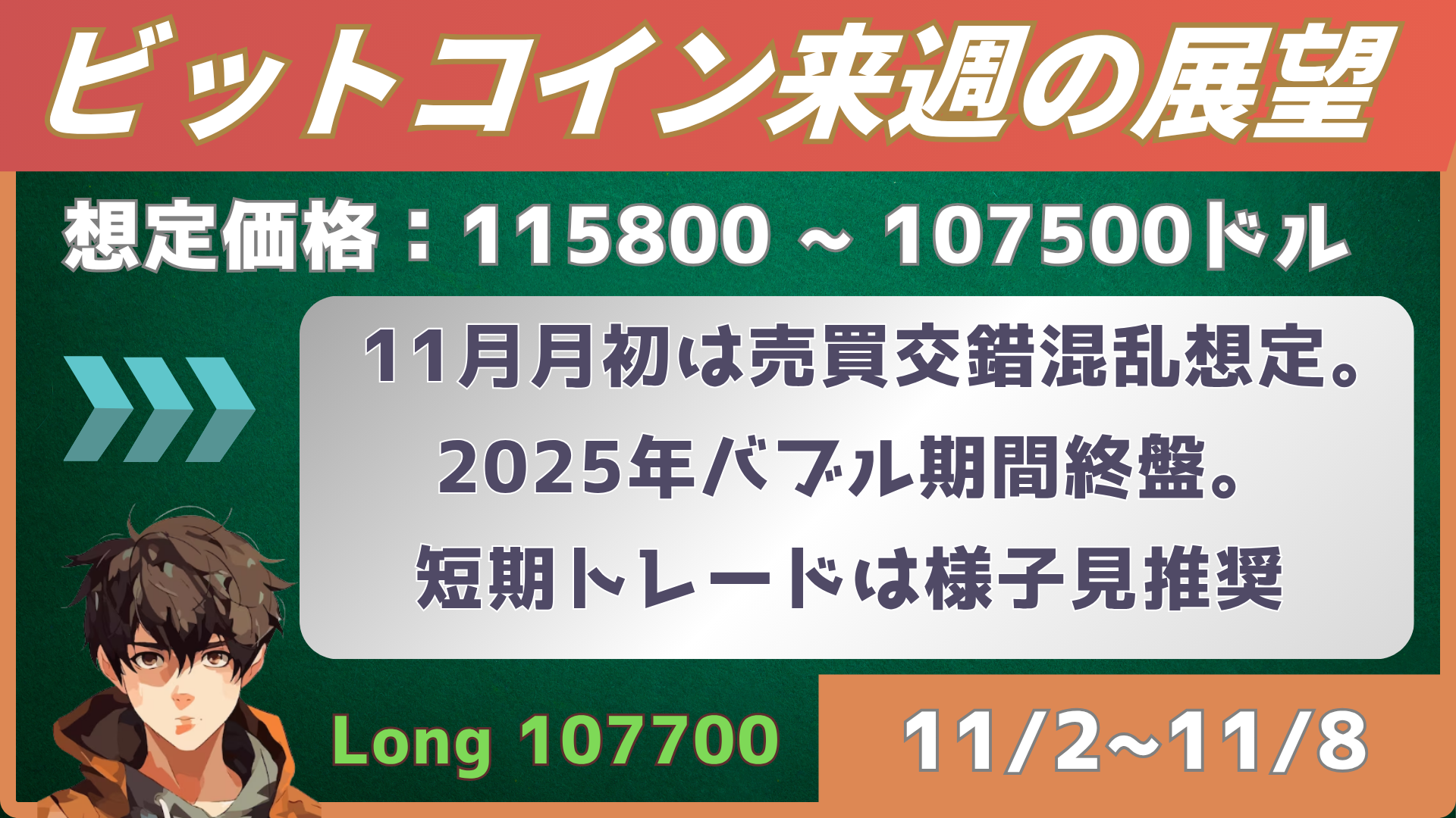 来週のビットコイン想定価格レンジは115800ドルから107500ドルです。ちなみに現在の価格は110800で、先週から2700ドル安。