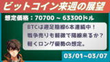 来週10万7000ドルまで価格上昇できた場合、このあたりの価格がロング利確やショートの目安となりそうです。