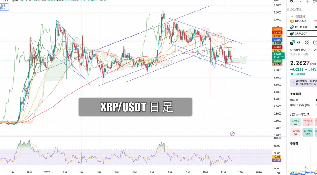 XRPリップルは先週のレポート通り、2.5ドルが逃げ場となり、再度売り込まれています。チャート的にも下降チャネルが続きますので、引き続き逃げを推奨します。