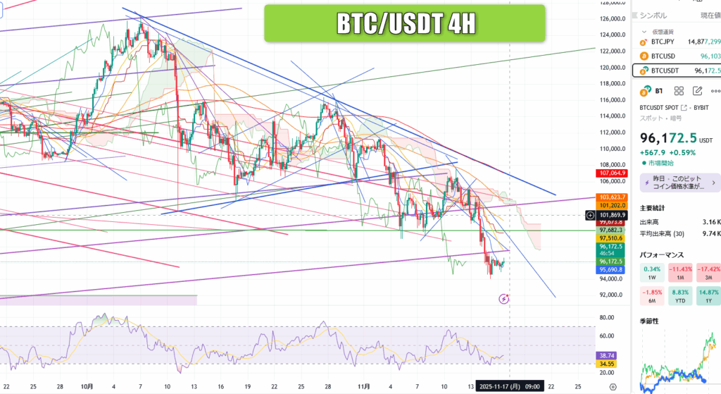ビットコインは1年以上続く中期上昇サポートラインを大きく割って94000ドル割れまで売られました。こうなると今期の仮想通貨バブルは終了と判断されます。あとは良いところで利確して資金を保存しましょう。