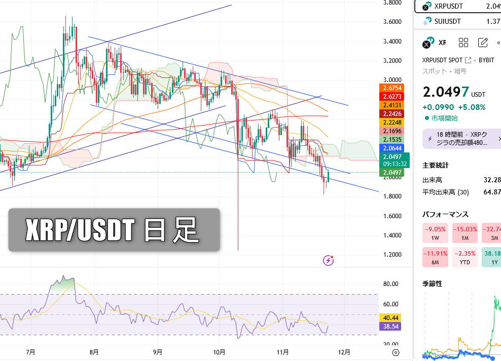 XRPリップルもだいぶ持ちこたえた方ですが、1.8ドル台まで下落。上記日足チャートの通り下降チャネルが引き続き続いています。