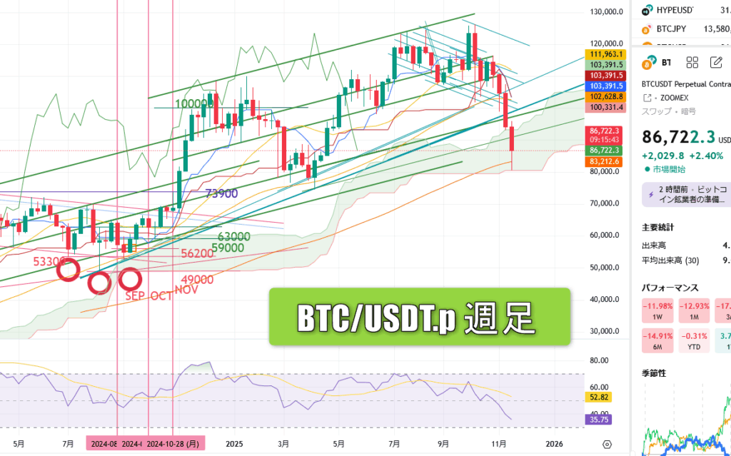 来週のビットコイン想定価格レンジは91800ドルから81500ドルです。ちなみに現在の価格は86700ドルで、先週から9700ドル安。BTC終了後の徹底的売り。
