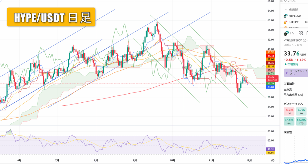 今週のチャートはHYPEの日足チャートです。相変わらずの下降トレンドですが、目先37ドルぐらいまでの上昇があっても良いような機運です。