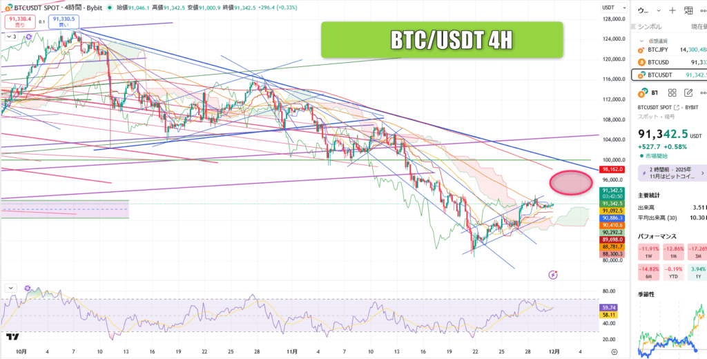 ビットコインは感謝祭前に買いが入り無事9万ドル回復。来週もある程度買わる観測も、下降ライン付近の急落に注意したいところ。バブル終了観測でショート優勢も12月の乱高下波乱はあるか。