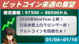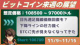 来週のビットコイン想定価格レンジは96500ドルから86300ドルです。ちなみに現在の価格は91300で、先週から4600ドル高。まずは下げ止まって価格回復してくれてよかった。