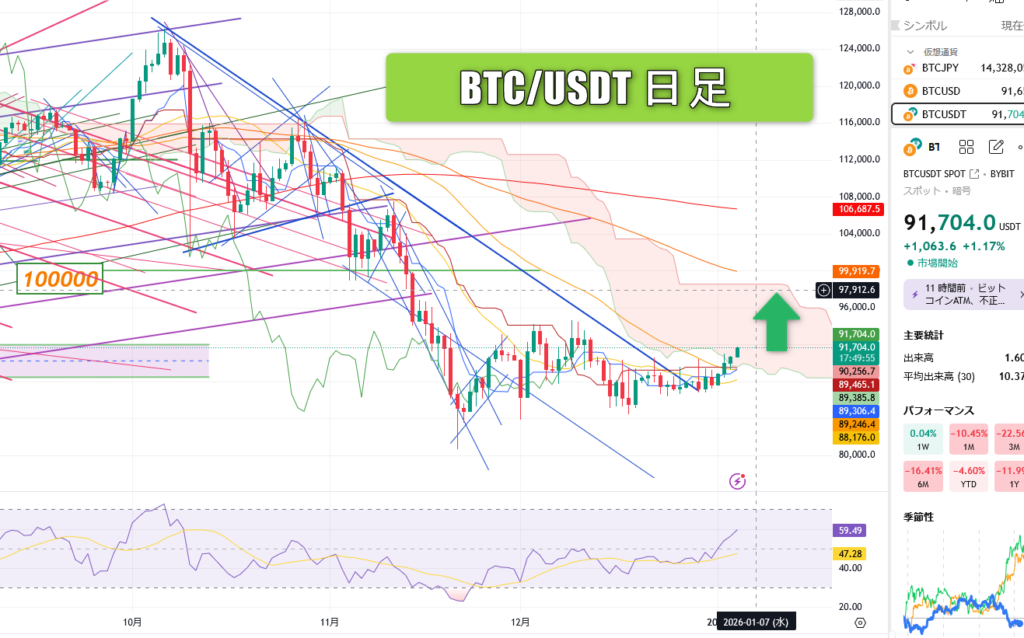 ポイントは、日足の赤雲に下から突入している点です。この状況においては、95000ドルぐらいまではどこかで一気に上昇することも良くあります。
