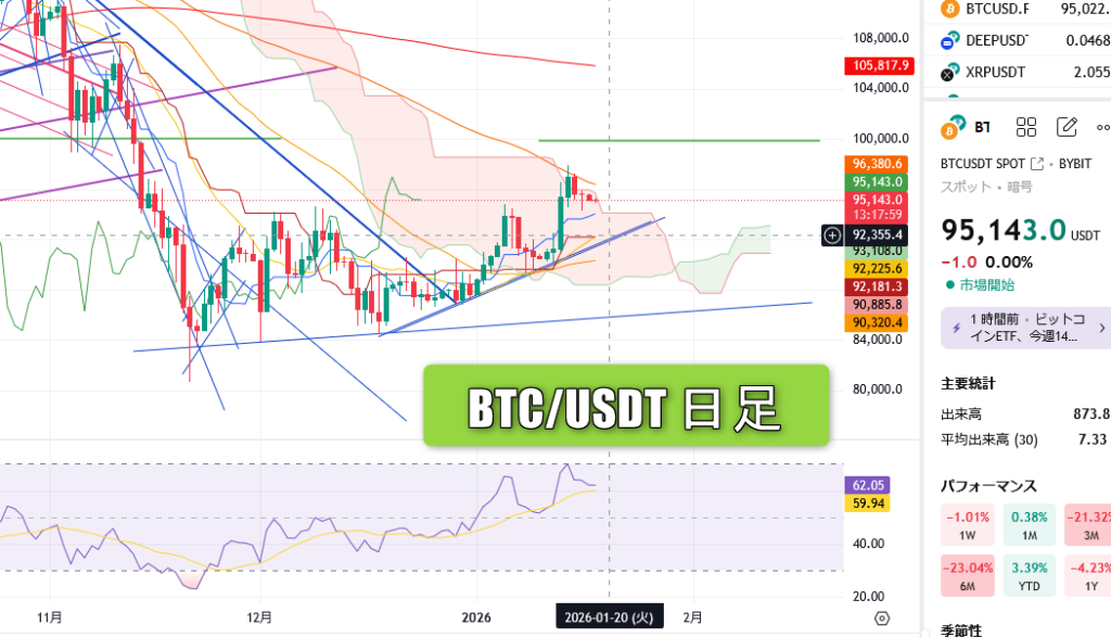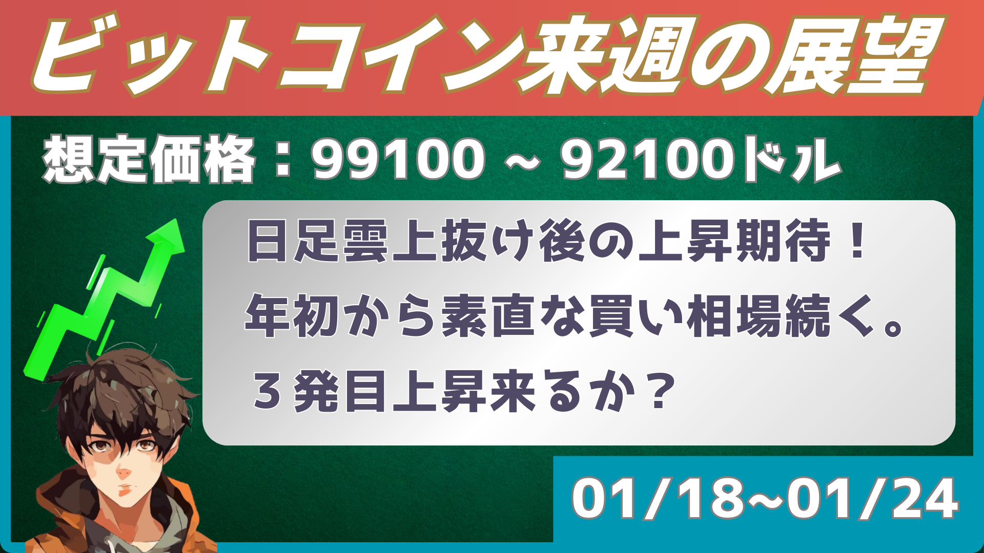 来週のビットコイン想定価格レンジは92100ドルから99100ドルです。ちなみに現在の価格は95100ドルで、先週末から4400ドル高!