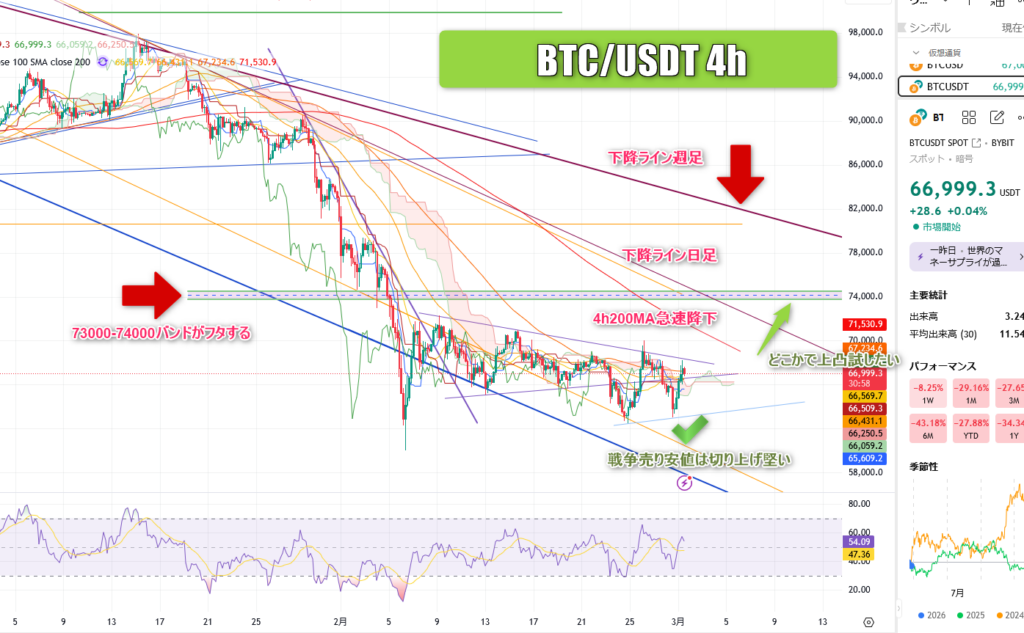 ブレイク対象は4h200MAと日足単位下降ライン、ブレイク後は73000-74000付近の水平バンドがフタをするので高値狙いは難しい観測。