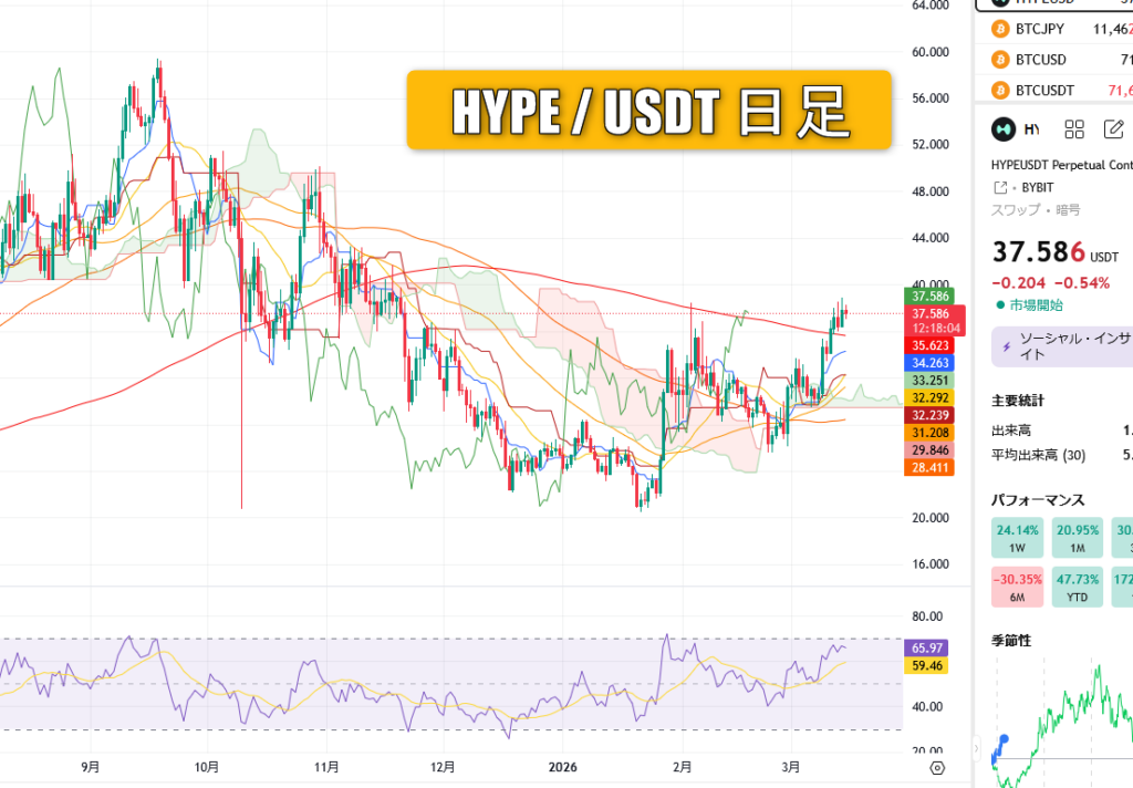HYPEは先週時点では踏み上げ解消の下落注意で見ていましたが、なんと真逆の日足一気上昇200MA35ドルブチ抜き!の25%上昇となりました。