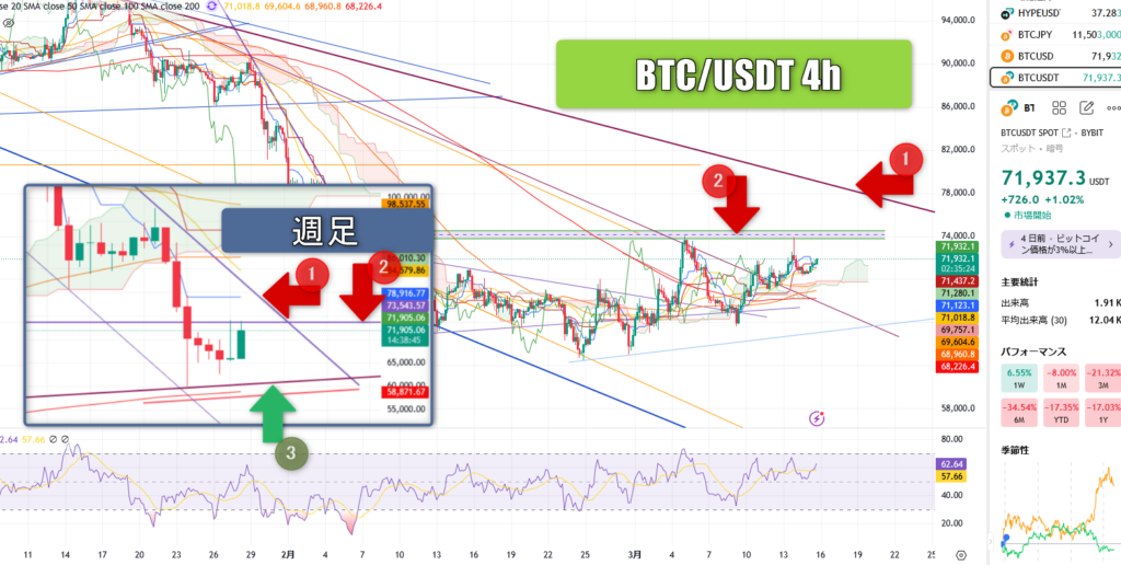直近4h足単位では堅調に買いが続いていますが、その背景には週足ウェッジ内価格推移前提で下が固く、ウェッジ下降ライン80000ドル付近との乖離が大きいため、自然と価格上昇しやすかったという環境があります。