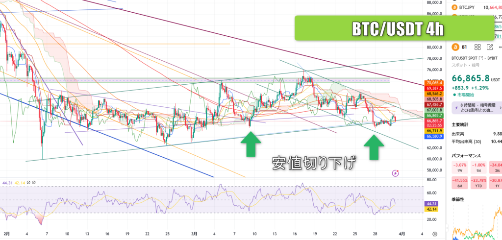 これは3月8日の安値65600ドルより安値切り下げで、要するに完全に弱気チャートとなりました。